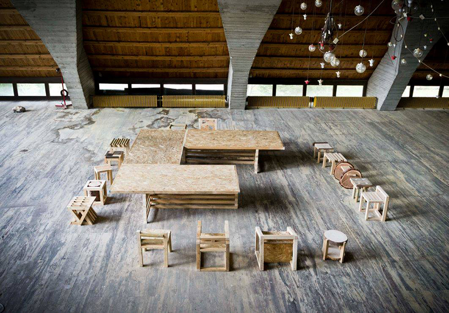 Ognuno dei partecipanti infatti, utilizzando materiali lignei trovati e riciclati (pali, pannelli OSB, morali), e la consulenza operativa in situ di un falegname, ha realizzato la propria personale seduta, mentre tutti insieme hanno costruito un grande tavolo da lavoro, e riallestito, con arredi lignei e altri materiali, una luminosa sala della Colonia, al Padiglione M.