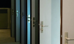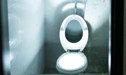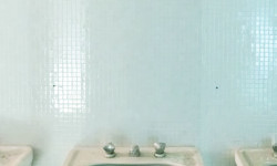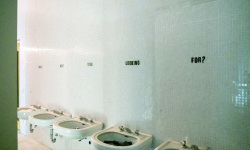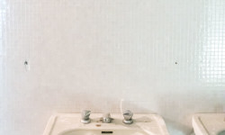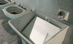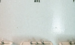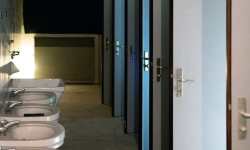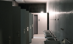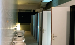 Uno spazio lungo e stretto, costellato dalla batteria degli usci dei servizi, lavabi e superfici ceramiche che ancora riecheggiano la presenza di corpi e gesti passati.