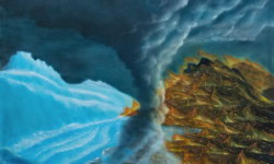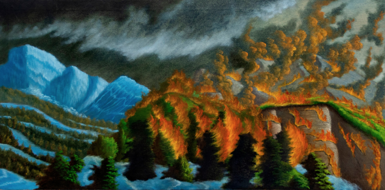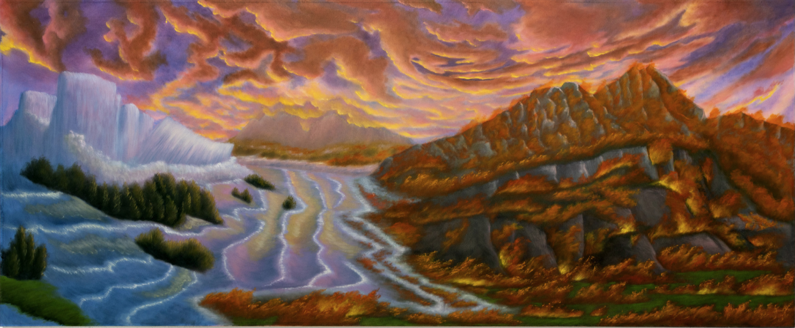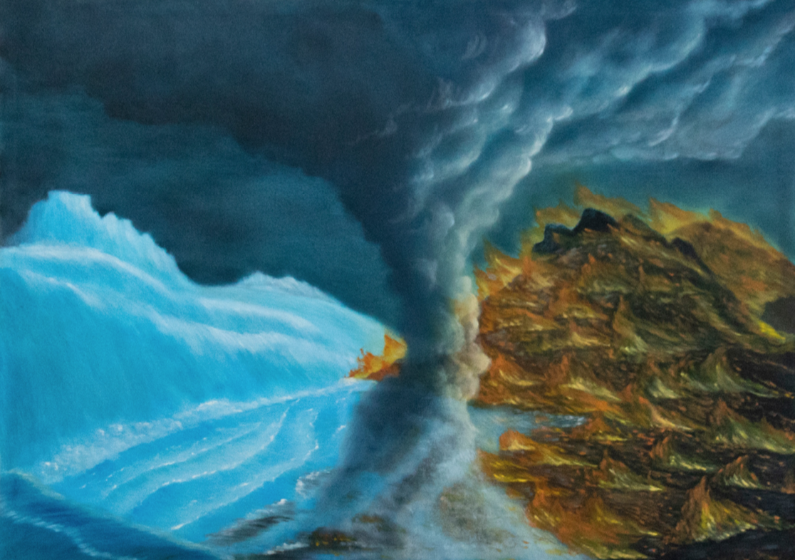 Il Pelmo, dunque, si trasforma in una massa di acqua e ghiaccio che scende inondando ogni cosa, e che si congiunge al centro dell’immagine con il Fuoco, l’elemento associato all’Antelao, che arde su tutta la superficie della montagna.