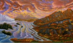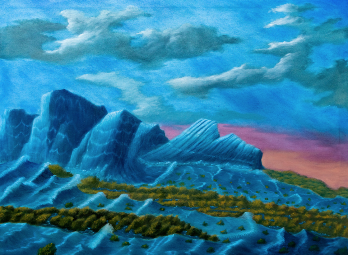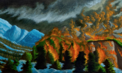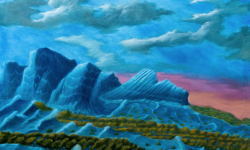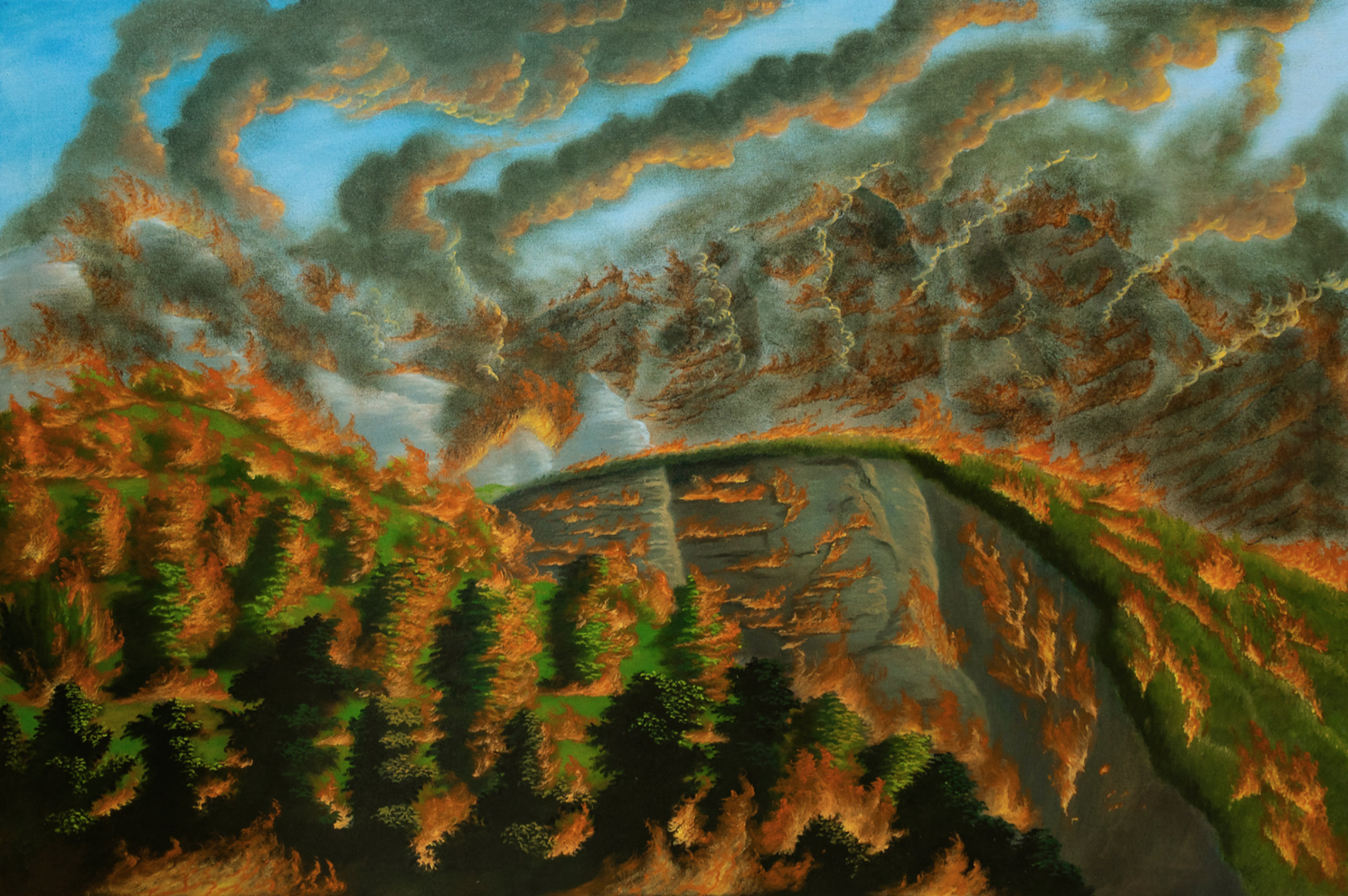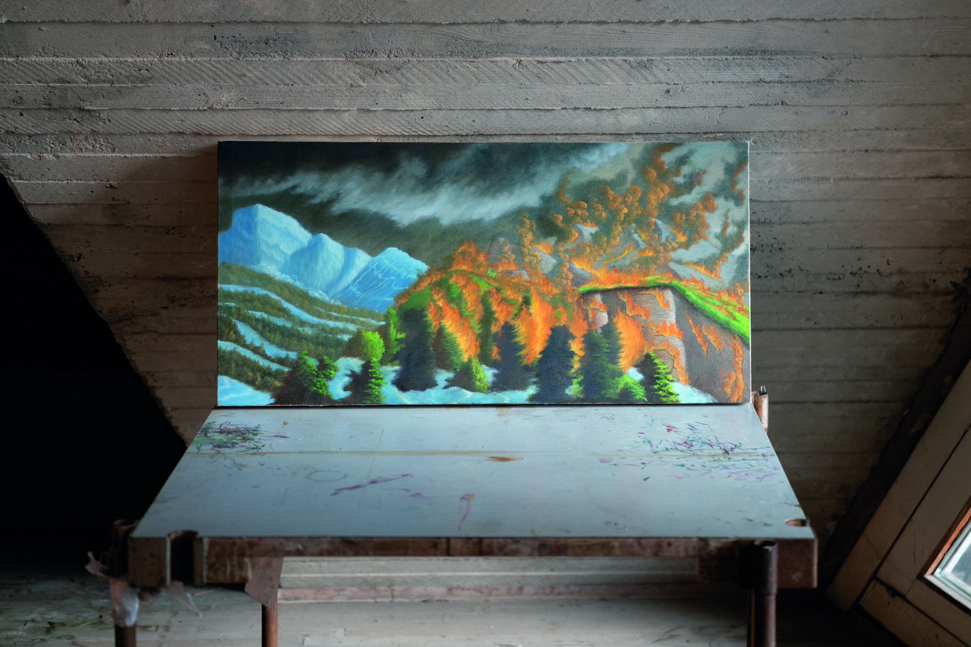1. La terraformazione di Borca secondo la leggenda del diavolo e dell’acqua santa, olio su tela, 70×100 cm, ottobre 2023