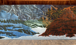 La terraformazione di Borca secondo la leggenda del diavolo e dell’acqua santa, olio su tela, 200×500 cm, ottobre 2025, Aula Magna, Corte di Cadore (foto Teresa De Toni)