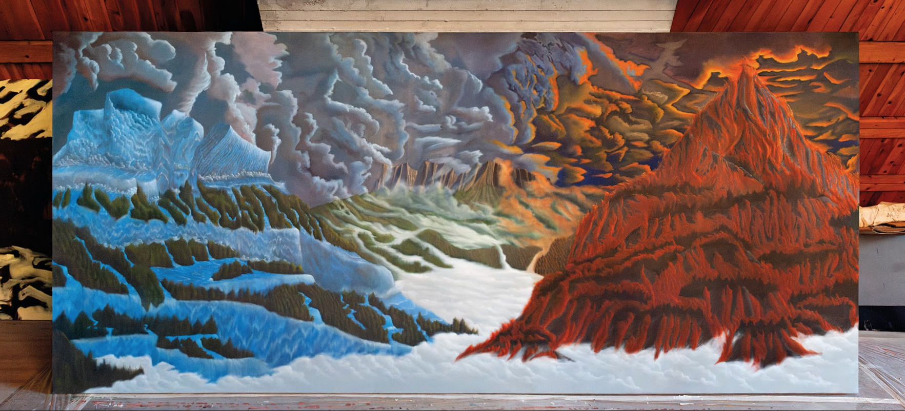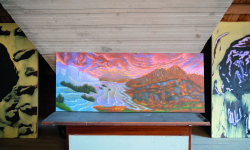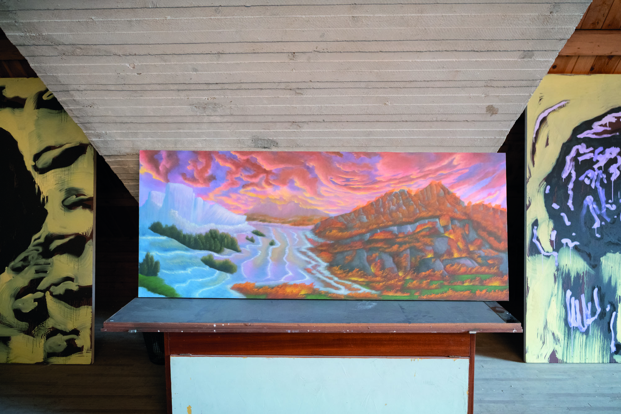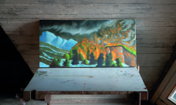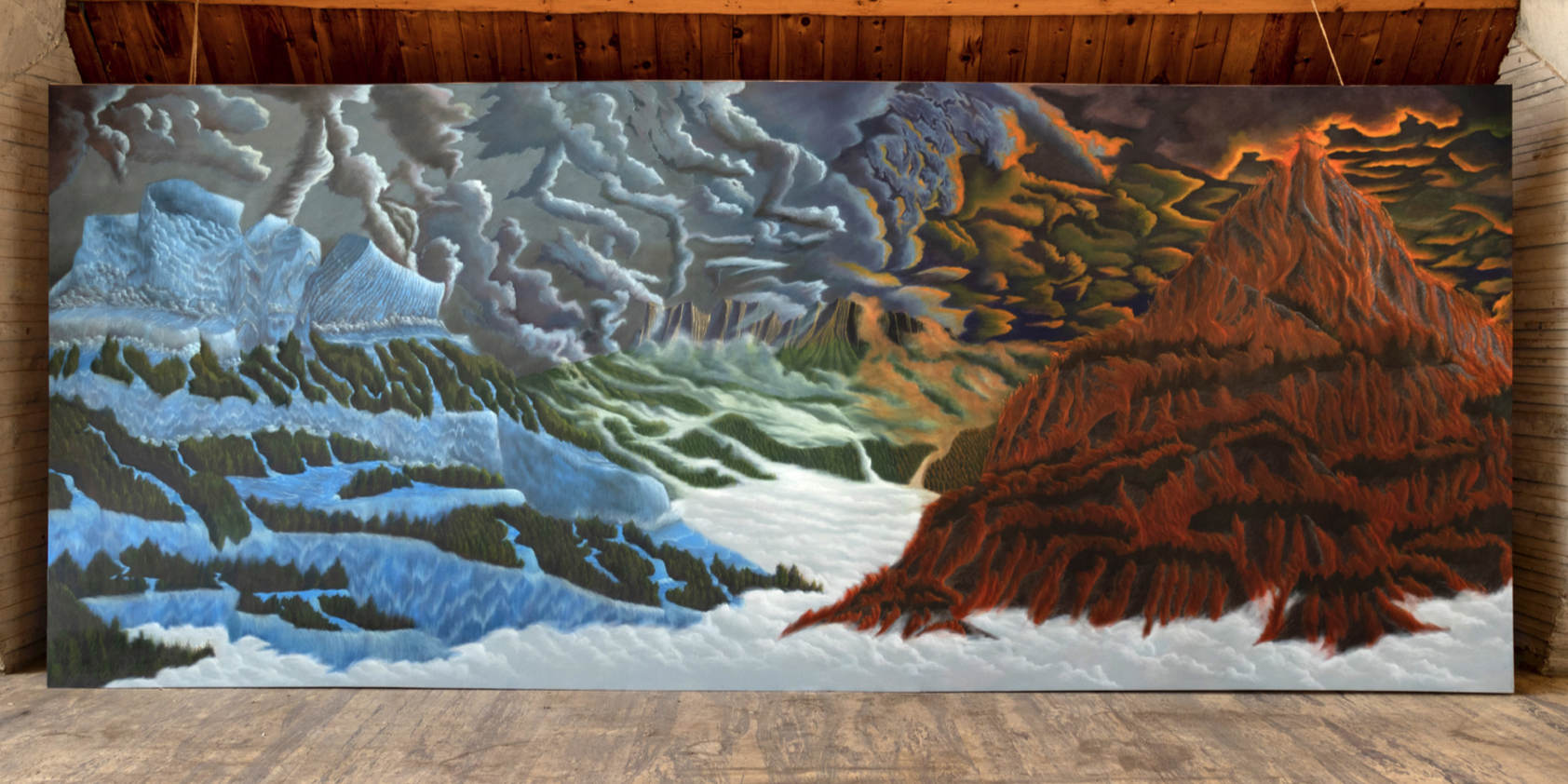 3. La terraformazione di Borca secondo la leggenda del diavolo e dell’acqua santa, olio su tela, 200×500 cm, 2025