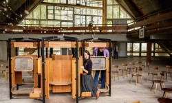 Talkonfession, la grande installazione di Michelangelo Penso, ha preso la scena per un giorno. I quattro confessionali lignei originali di Gellner, le ottanta sedie originali di Fantoni, le trenta interviste registrate, voci di intellettuali noti mescolate a quelle delle persone di Borca, a raccontare un’idea polifonica della Confessione, oltre alla storia (confessata) del rapporto tra questa comunità di Borca e questo Villaggio, delle alienità e delle in/comprensioni.